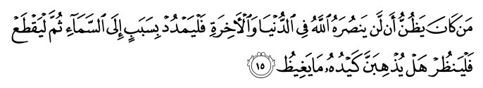 مَن کَانَ یَظُنُّ أَن لَّن یَنصُرَهُ اللَّهُ فِی الدُّنْیَا وَالْآخِرَةِ فَلْیَمْدُدْ بِسَبَبٍ إِلَى السَّمَاءِ ثُمَّ لْیَقْطَعْ فَلْیَنظُرْ هَلْ یُذْهِبَنَّ کَیْدُهُ مَا یَغِیظُ