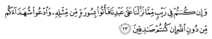 وَإِن کُنتُمْ فِی رَیْبٍ مِّمَّا نَزَّلْنَا عَلَى عَبْدِنَا فَأْتُوا بِسُورَةٍ مِّن مِّثْلِهِ وَادْعُوا شُهَدَاءَکُم مِّن دُونِ اللَّهِ إِن کُنتُمْ صَادِقِینَ