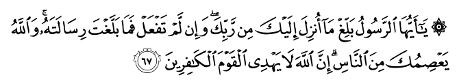 یَا أَیُّهَا الرَّسُولُ بَلِّغْ مَا أُنزِلَ إِلَیْکَ مِن رَّبِّکَ وَإِن لَّمْ تَفْعَلْ فَمَا بَلَّغْتَ رِسَالَتَهُ وَاللَّهُ یَعْصِمُکَ مِنَ النَّاسِ إِنَّ اللَّهَ لَا یَهْدِی الْقَوْمَ الْکَافِرِینَ