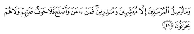 وَمَا نُرْسِلُ الْمُرْسَلِینَ إِلَّا مُبَشِّرِینَ وَمُنذِرِینَ فَمَنْ آمَنَ وَأَصْلَحَ فَلَا خَوْفٌ عَلَیْهِمْ وَلَا هُمْ یَحْزَنُونَ