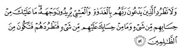 وَلَا تَطْرُدِ الَّذِینَ یَدْعُونَ رَبَّهُم بِالْغَدَاةِ وَالْعَشِیِّ یُرِیدُونَ وَجْهَهُ مَا عَلَیْکَ مِنْ حِسَابِهِم مِّن شَیْءٍ وَمَا مِنْ حِسَابِکَ عَلَیْهِم مِّن شَیْءٍ فَتَطْرُدَهُمْ فَتَکُونَ مِنَ الظَّالِمِینَ
